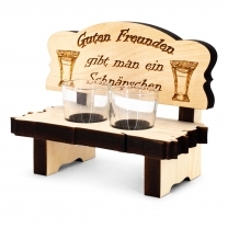 Unser Schnapsbänkchen lädt nicht nur zum Anstoßen ein, sondern ist auch noch ein richtiger Blickfang. In der Sitzfläche der Bank befinden sich zwei kleine Öffnungen, in denen die beiden Gläser optimal Platz finden.